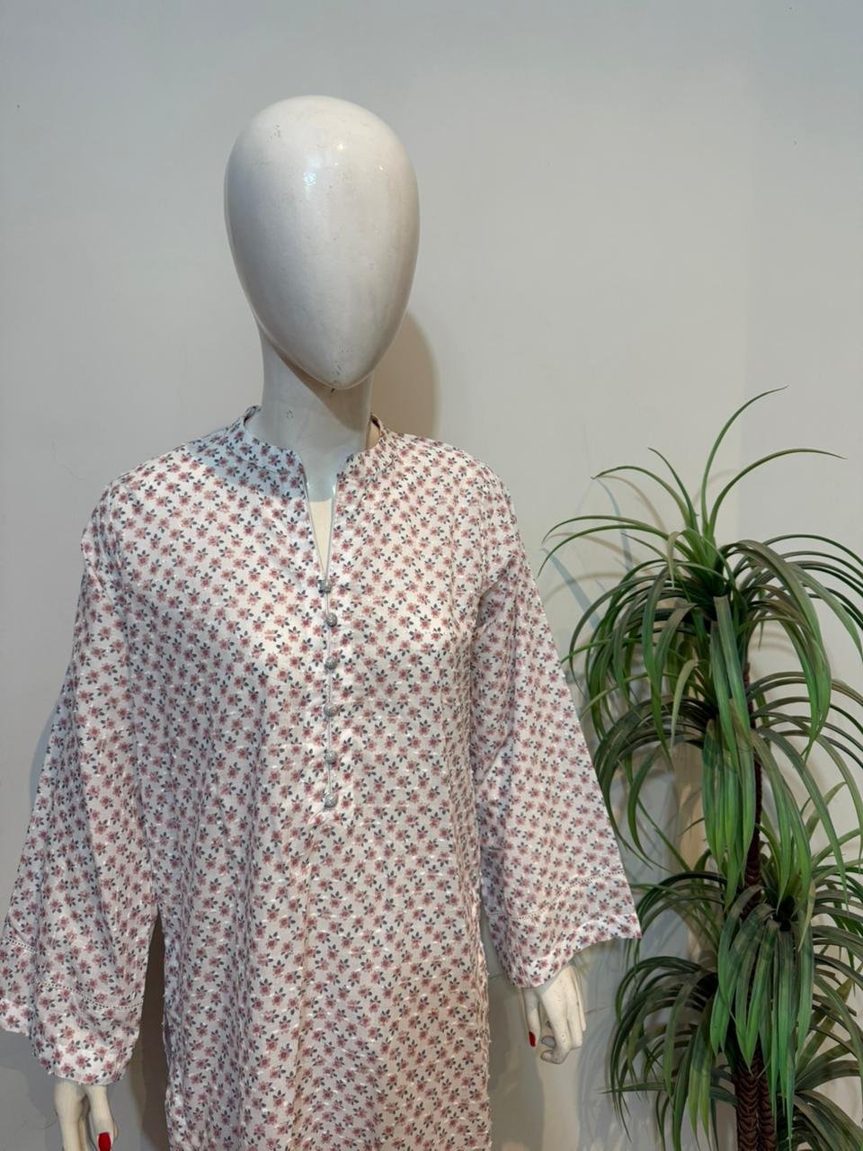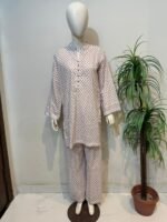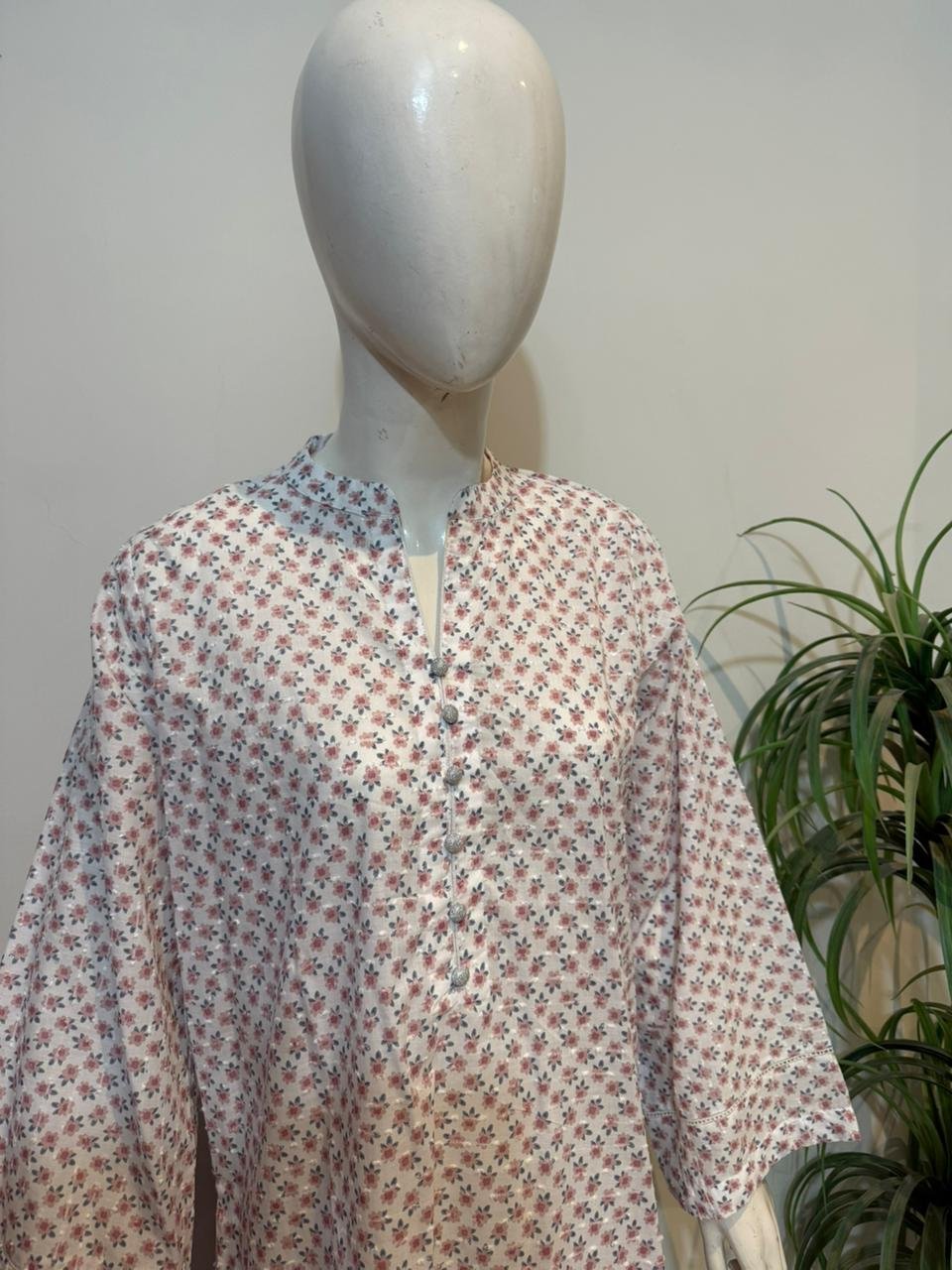 Our very chic white floral short kurta paired with same print culottes on broshia lawn fabric..