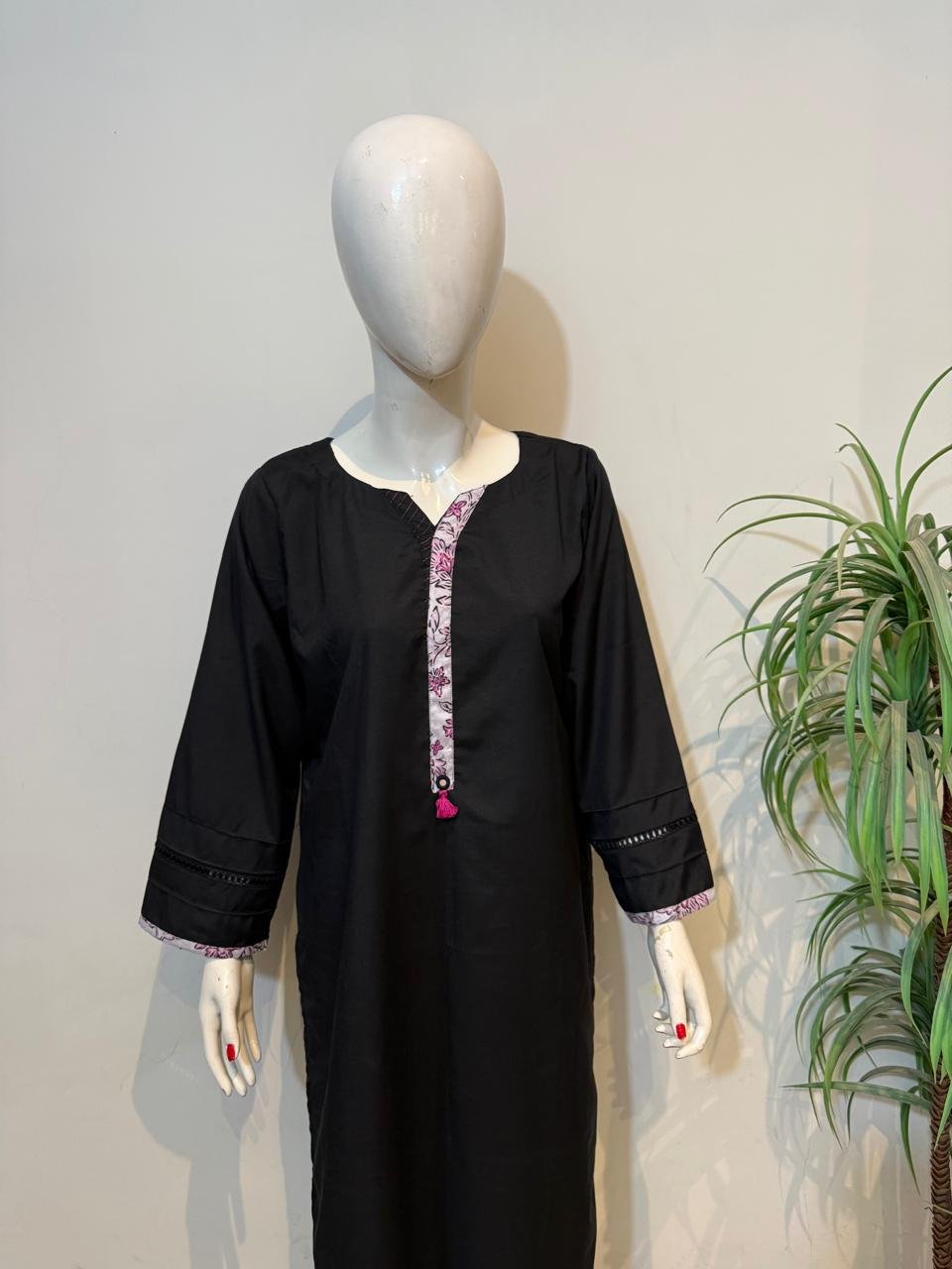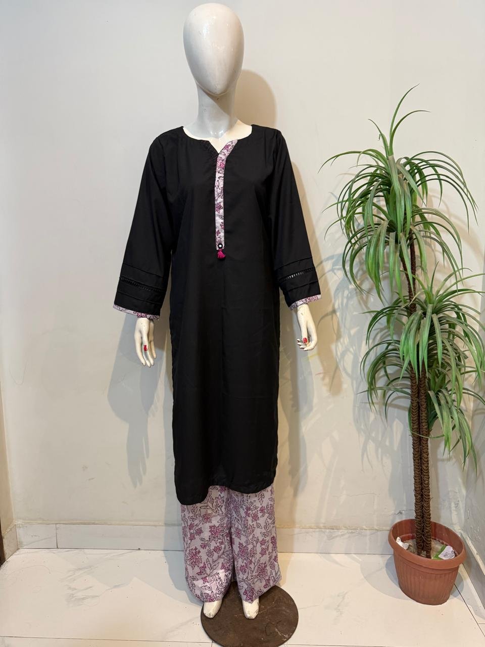 A plain viscose fabric black shirt with printed detailings on neckline and sleeves paired with printed trousers for that chic look..