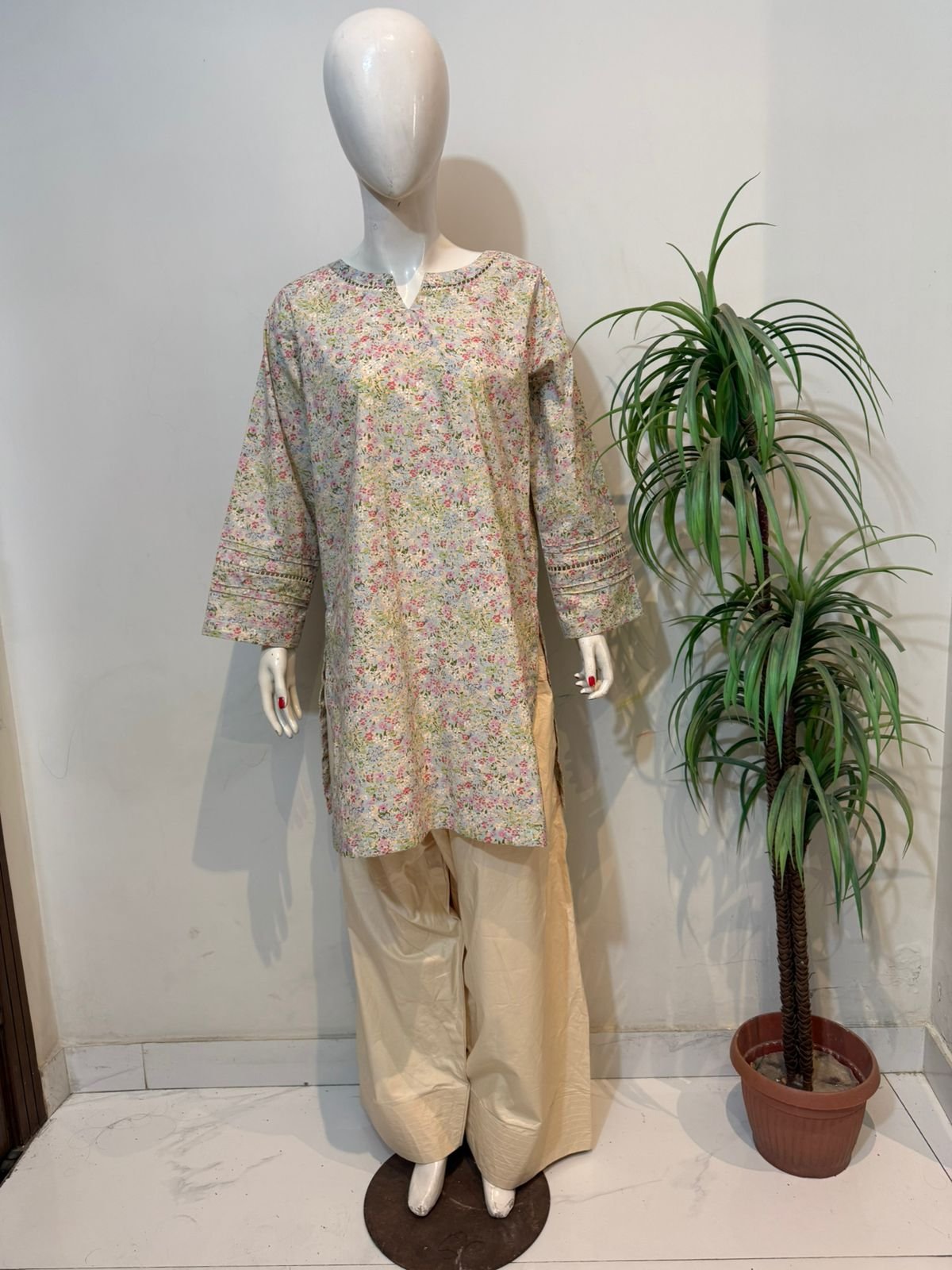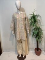 floral printed short kurta with beige farshi shalwar